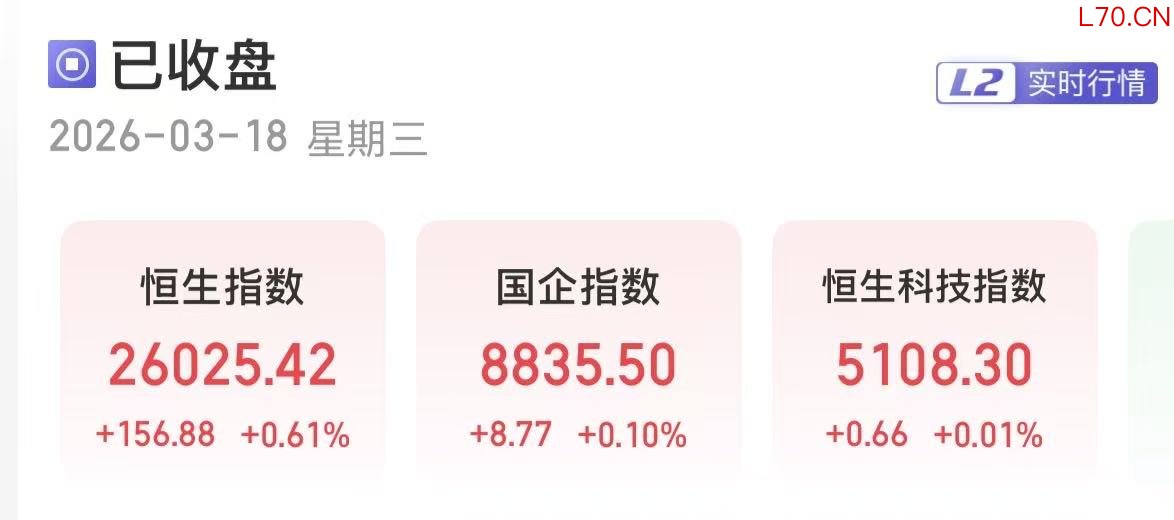 上证报中国证券网讯(刘禹希 记者 严晓菲)3月18日,港股三大指数午后走强,集体收红。截至收盘,恒生指数涨0.61%,报26025.42点;恒生国企指数涨0.1%,报8835.50点;恒生科技指数涨0.01%,报5108.30点。