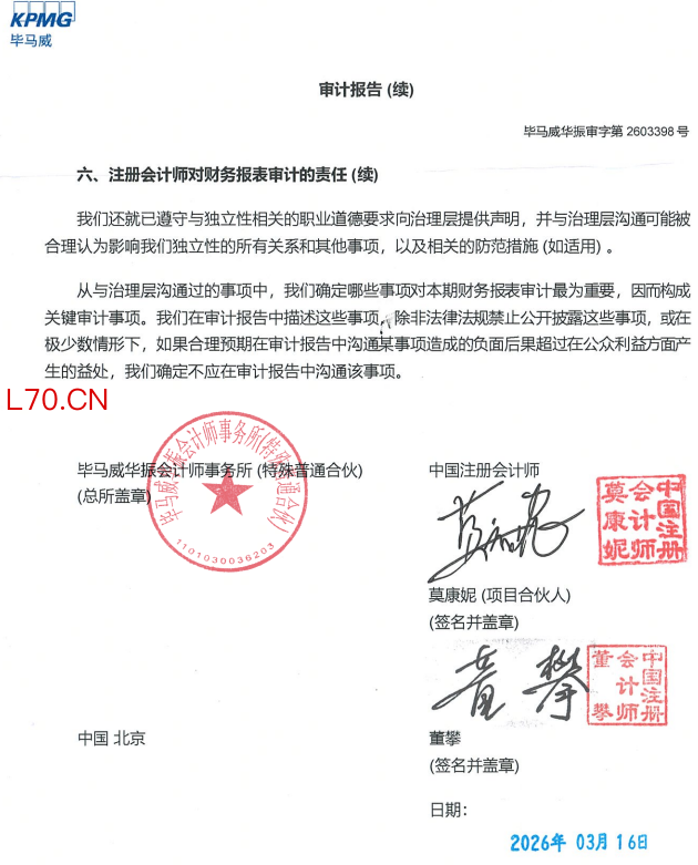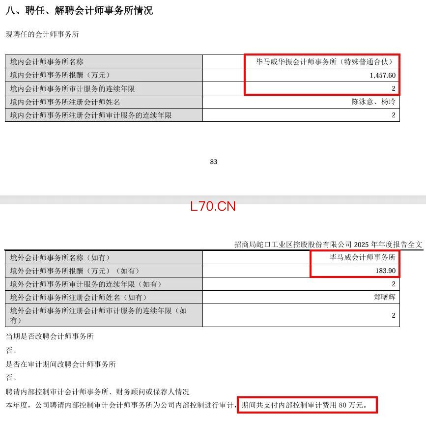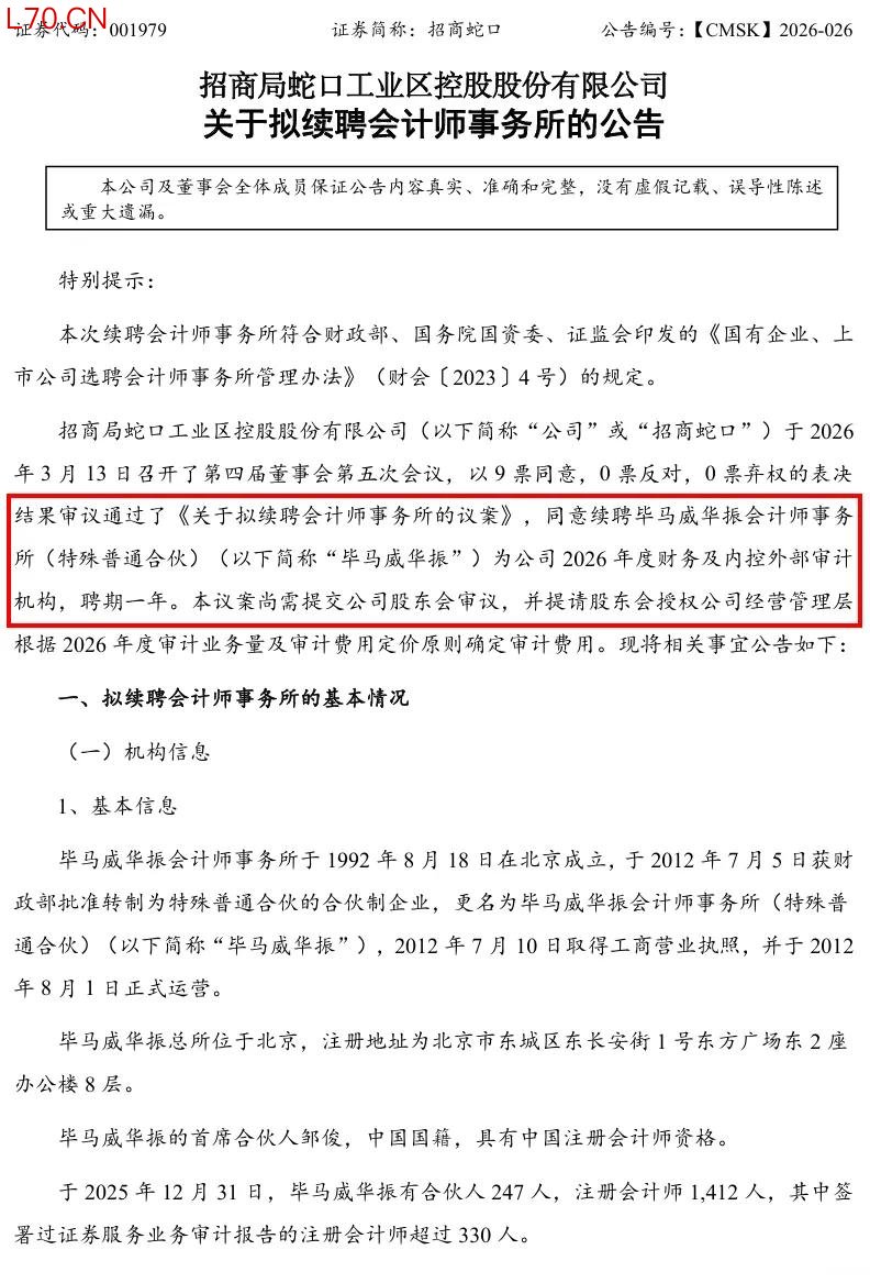 同日,招商蛇口发布的公告显示,董事会同意续聘毕马威华振会计师事务所(特殊普通合伙)为公司2026年度财务及内控外部审计机构。