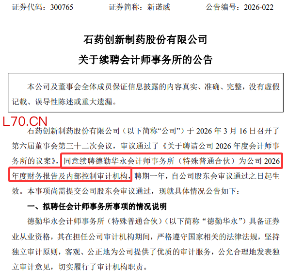 同日,新诺威发布的公告显示,董事会同意续聘德勤华永会计师事务所(特殊普通合伙)为公司2026年度财务报告及内控审计机构。