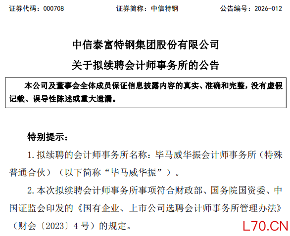 同日,中信特钢发布的公告显示,董事会同意续聘毕马威华振会计师事务所(特殊普通合伙)为公司2026年度财务及内控外部审计机构。公司拟就2026年度财务报表审计项目和内部控制审计项目向毕马威华振支付的审计费用不超过人民币400万元。