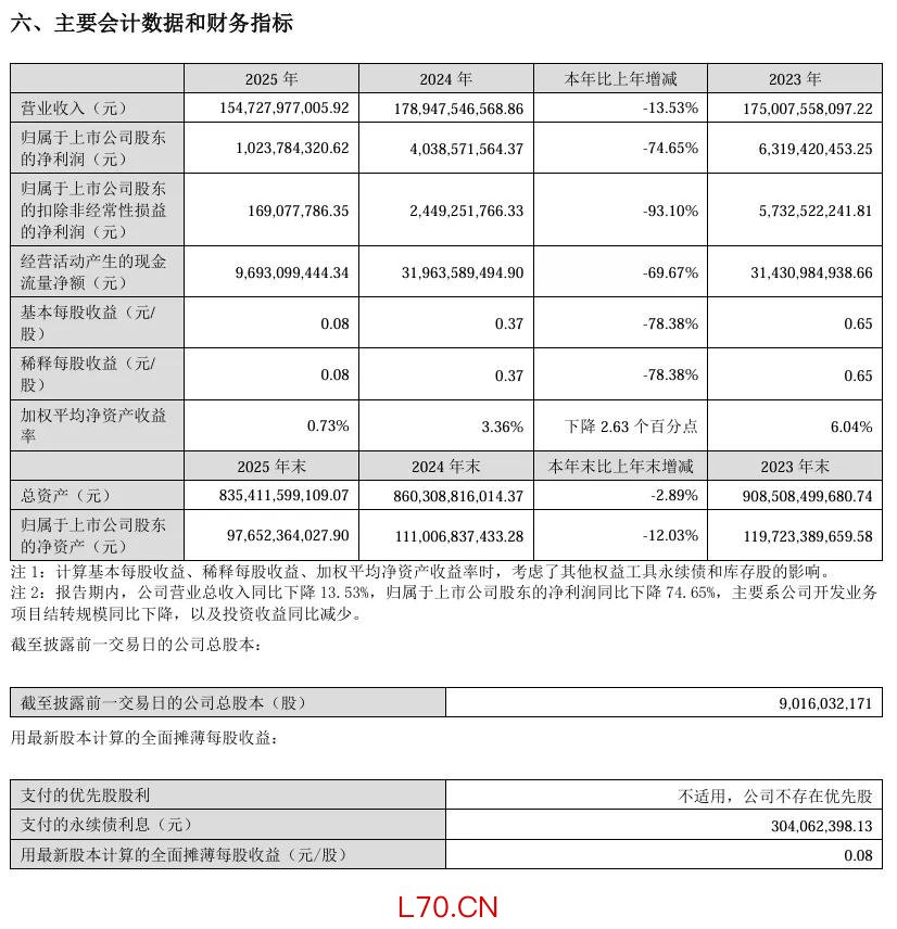 招商蛇口2025年年度报告显示,2025年公司实现营业收入1,547.28亿元,同比下降13.53%,实现归属于上市公司股东的净利润10.24亿元,同比下降74.65%,基本每股收益0.08元/股,同比下降78.38%。