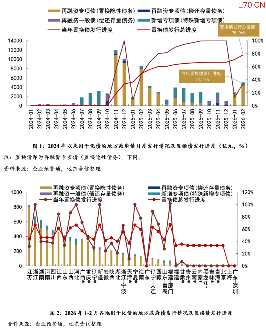 元股证券 摘要 2026 年开年,化债进展如何? 隐债化解: 1.地方政府债券置换:1-2月用于化债的地方债发行规模同比