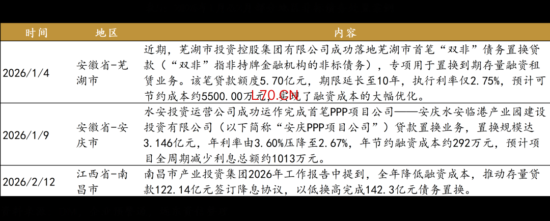从今年非标债务化解来看,1-2月共监测到2例非标债务化解案例,均位于安徽省;同时,江西南昌市产业投资集团2026年工作报告中提到,全年降低融资成本,推动存量贷款122.14亿元签订降息协议,以低换高完成142.3亿元债务置换。