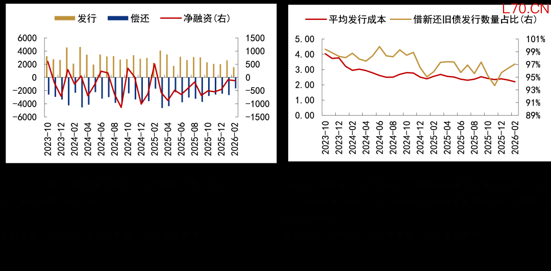 1-2月,城投债发行规模分别为2592、1545亿元,1月发行规模虽然同比增加28.9%,但净融资依然为负、持续承压。从募集资金用途来看,当前城投债仍以借新还旧为主,1-2月全部用于借新还旧的债券发行数量占比均超过了96%,仍处于高位。与此同时,城投债发行成本有所回落,1-2月平均发行利率分别为2.3%、2.2%,均较2025年12月有所下降。