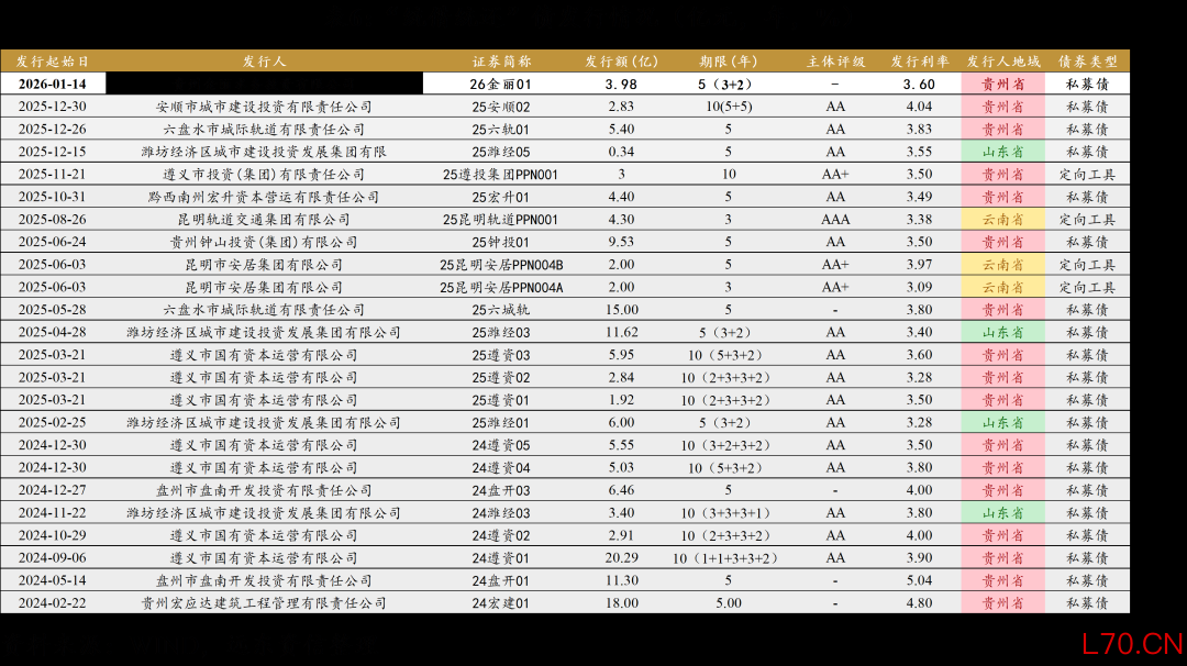 1-2月,仅新发行1只“统借统还”债券,发行主体为贵州金丽水务投资有限公司,该期债券为私募债,发行规模3.98亿元,票面利率3.6%。受限于多项严苛条件,该类债券整体落地案例仍较为有限。截至2026年2月末,全市场累计发行24只“统借统还”债券,发行区域高度集中,主要分布于贵州、云南两个重点省份,以及纳入重点地市名单的山东潍坊。