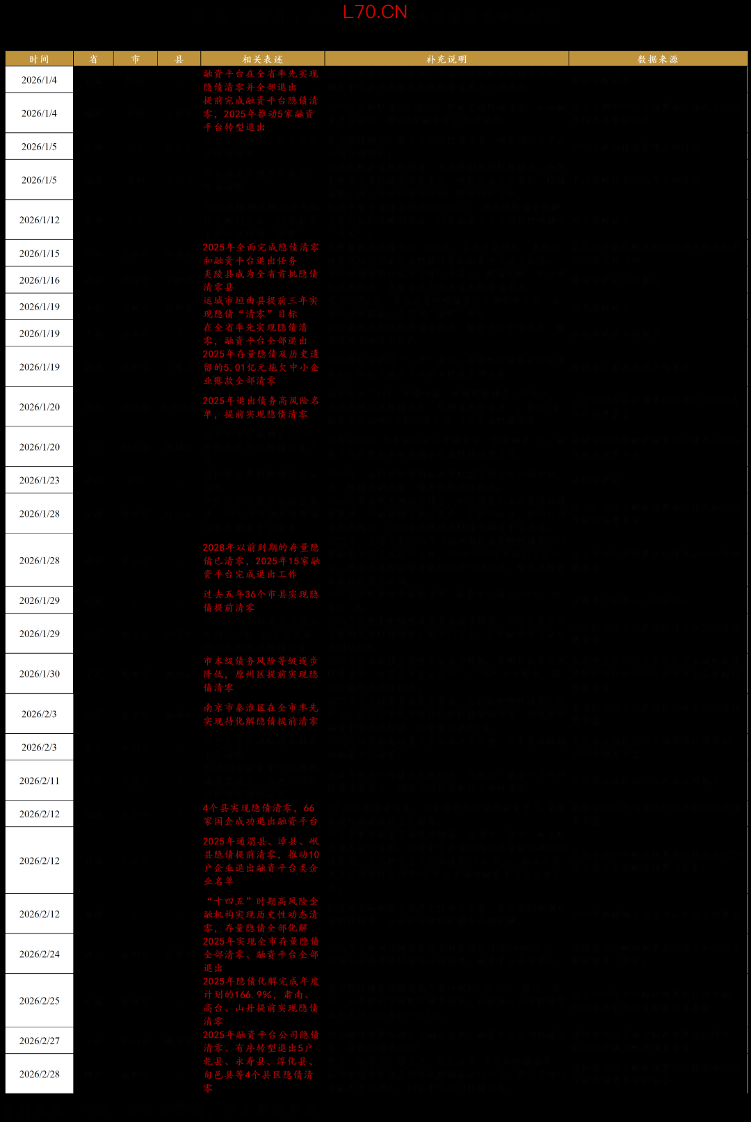 2.隐债清零:据不完全统计,截至2026年2月底已有广东、北京、上海、新疆四个省/直辖市和34个地级市及175个区县宣布已完成隐性债务清零的目标。