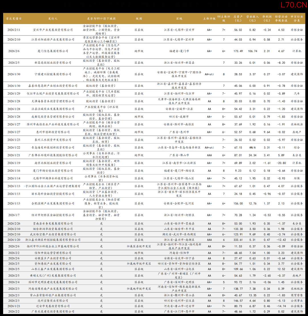 2026年1-2月,类城投产业主体共有85家,整体资产规模较小、信用资质偏弱。我们重点观察无争议的类城投产业主体(即既非Wind口径城投、也非YY口径城投),共计22家,主要分布在浙江、江苏、福建、天津、四川、广东、山东和安徽8省/直辖市。从业务来看,新增主体业务类型较为多元,主要涵盖股权投资(10家)、产业控股(7家)、金融控股(2家)、公用事业(2家)及文旅运营(1家)等五类平台。其中,股权投资及产业控股类主体数量较多,主要承担区域产业投资与产业资源整合职能;金融控股类主体则依托金融牌照或金融机构股权开展投资业务;公用事业和文旅类主体业务模式相对清晰,现金流稳定性整体较好,但盈利水平及行业景气度存在一定差异。