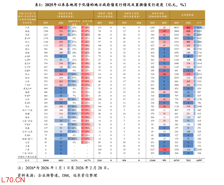 1-2月用于化债的地方债发行规模同比下降,江苏、浙江、湖南等地发行规模相对较高。2026年1-2月,受用于项目建设的新增专项债发行提速、发行规模同比增加等因素影响,用于化债的地方债发行规模有所下降,1-2月共计发行7832亿元、同比减少2516亿元;其中,用于置换隐性债务的再融资专项债发行6833亿元,同比下降2709亿元,特殊新增专项债发行999亿元,同比增加193亿元;尚未有用于偿还存量债务的再融资债券启动发行。