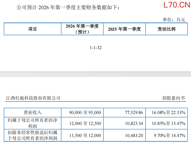 招股意向书显示,红板科技预计其2026年第一季度的营业收入为9亿元至9.50亿元,同比增长16.08%至22.53%;归母净利润为1.20亿元至1.25亿元,同比增长10.85%至15.47%。