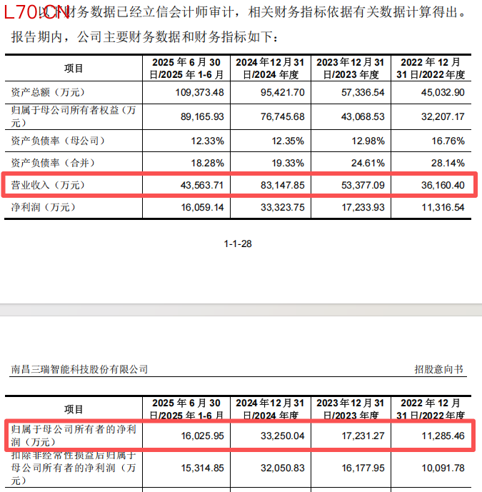2022年至2024年及2025年上半年,三瑞智能的营业收入分别为3.62亿元、5.34亿元、8.31亿元及4.36亿元,归母净利润分别为1.13亿元、1.72亿元、3.33亿元及1.60亿元。