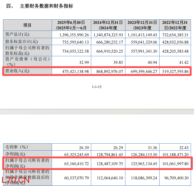 2022年至2024年及2025年上半年,隆源股份的营业收入分别为5.19亿元、6.99亿元、8.69亿元及4.75亿元,归母净利润分别为1.01亿元、1.26亿元、1.28亿元及6516.04万元。