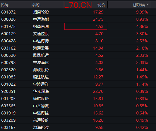 元股证券海运股低开高走,招商轮船涨停,中远海能冲击涨停,招商南油涨逾6%。