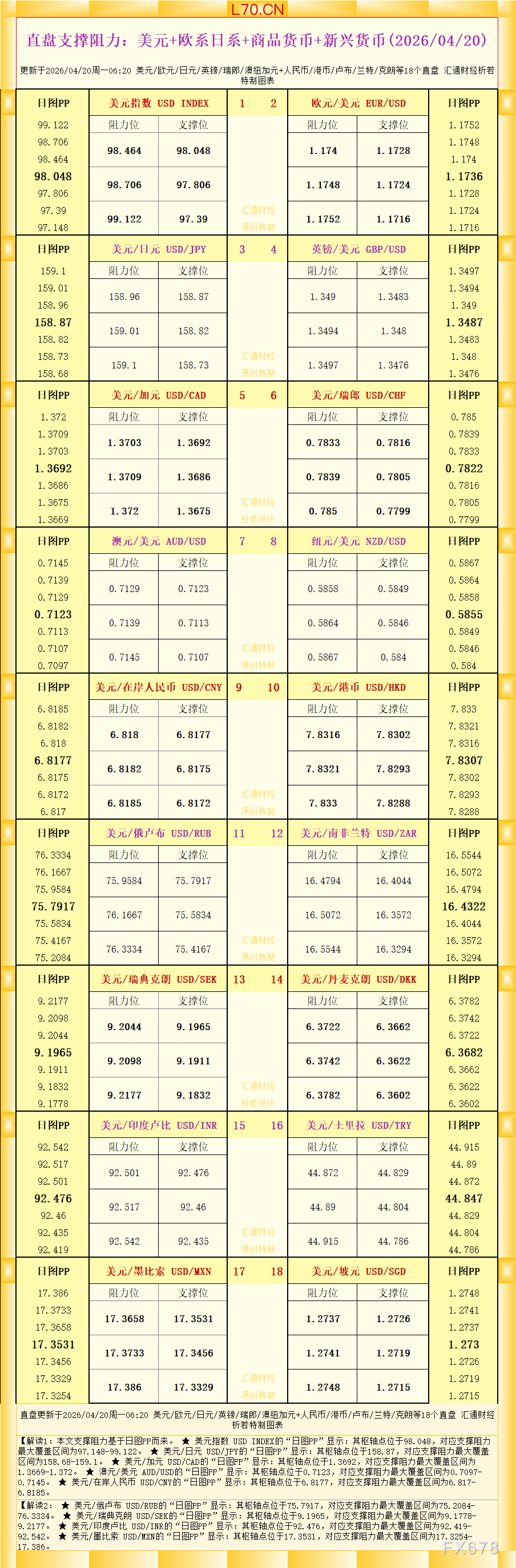 汇通财经APP讯——一张图看直盘支撑阻力:美元+欧系日系+商品货币+新兴货币,更新于2026年4月20日周一06:20,具体美元/欧元/日元/英镑/瑞郎/澳纽加元+人民币/港币/卢布/兰特/克朗等18个直盘,更多详见汇通财经析若特制图表中的内容。