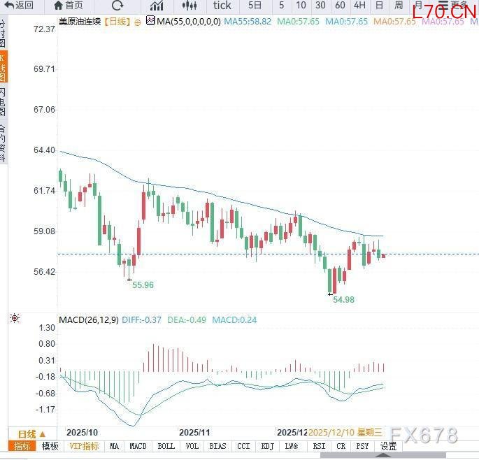 从日线图形来看,美原油(WTI)仍处于弱势整理格局。价格在前期大幅下跌后运行于中长期均线下方,日线级别均线系统呈现空头排列,反映整体趋势仍偏向下行。
