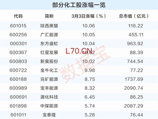 3月3日,相关化工股市场表现强势,平均涨幅达到2.13%,陕西黑猫、广汇能源、东方盛虹等多股涨停,兖矿能源和宝丰能源等涨幅均超过8%。