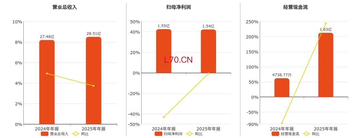 公司营业总收入为28.51亿元。归母净利润为1.54亿元,较去年同报告期归母净利润减少116.52万元,同比较去年同期下降0.75%。经营活动现金净流入为1.63亿元。